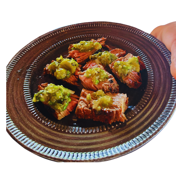 Con la pasta realizada masajear el corte de res y dejar reposar 10 minutos, luego llevar a la parrilla a fuego directo durante 4 minutos por cada lado luego pasar a fuego indirecto otros 3 minutos por lado hasta obtener 55–60 °C para término medio o 60–70 °C para 3⁄4, dejar reposar el 20% de tiempo de cocción, cortar en contra de la fibra en lonjas, servir y acompañar con chimichurri o salsa verde.