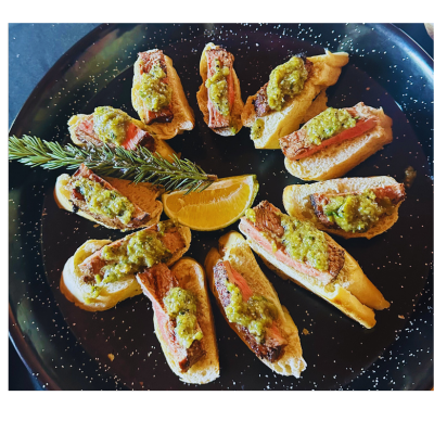 Cortar el pan Ciabatta en lonjas y poner sobre las parrilla vuelta y vuelta, retirar de la parrilla y luego a todos los trozos de pan colocar encima una lonja de ribeye, luego agregar salsa verde sobre el corte y listo a disfrutar la delicia.