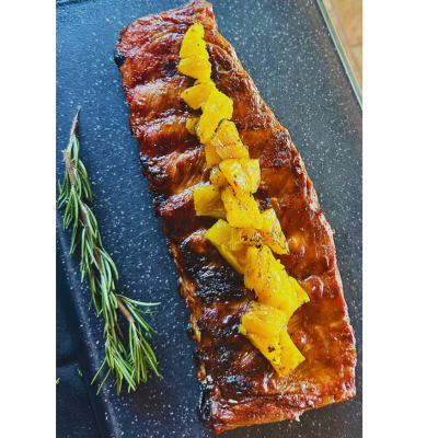 c) Cortar en rebanadas muy delgadas, acomodar en un plato extendido, hacer un espejo con la salsa guajillo y decorar con relish de piña.